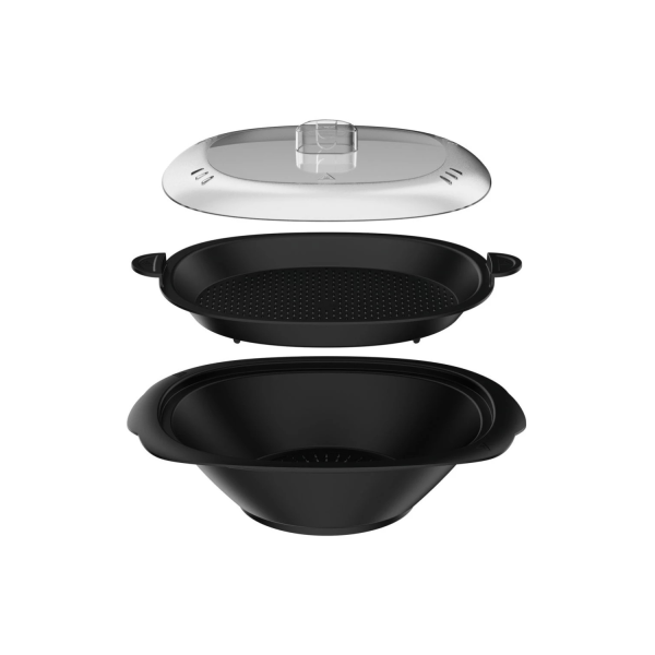 • Livré avec : Livre de recettes, balance de cuisine, batteur, bol en acier, couvercle anti-projections, lame polyvalente, mélangeur, panier de cuisson, panier vapeur, spatule